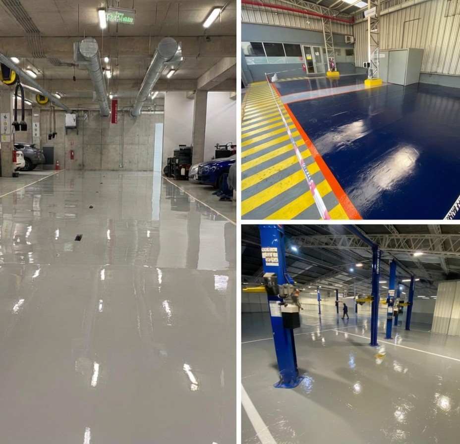 Aplicación de revestimientos epóxicos para pisos industriales y de alto tráfico.